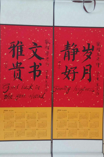 我市新观念作家,双语书法家,英语词汇学者特意给毛里求斯姑娘送上新年的大祝福年历。两幅手写的大楷福字下面是毛笔英文good luck in the year ahead.live long and prosper.