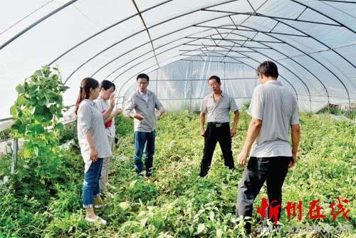 近日,山西农业大学园艺学院设施蔬菜专家团队走进河曲县文笔镇南元村进行果蔬生产指导。老师们深入田间地头,有针对性地对塑料大棚和露地不同品种选取、育苗技术、栽培管理技术、病虫害防控等进行了系统讲解。图为老师们在瓜农郭混田家的大棚现场指导。
