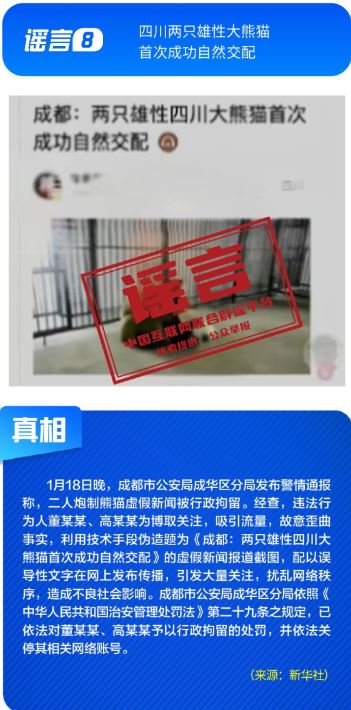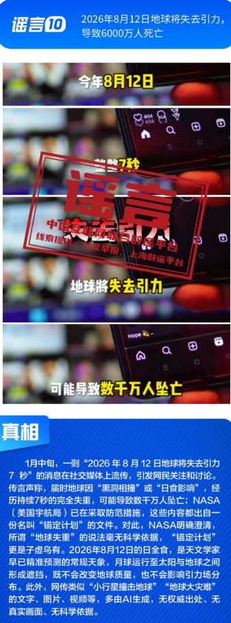 健康与科普领域谣言违背客观规律。“人血白蛋白是‘增加免疫力’的法宝”刻意夸大该处方药的临床用途,忽略其特定医疗场景与使用风险;所谓“大棚草莓、冷库葡萄、进口车厘子、染色砂糖橘是冬天水果界四大毒王”谣言片面解读农产品种植与保鲜方式,缺乏科学依据;“四川两只雄性大熊猫首次成功自然交配”纯属为吸引流量而捏造的猎奇内容,其视频画面为AI生成;“2026年8月12日地球将失去引力,导致6000万人死亡”更是无中生有的荒谬谣言。