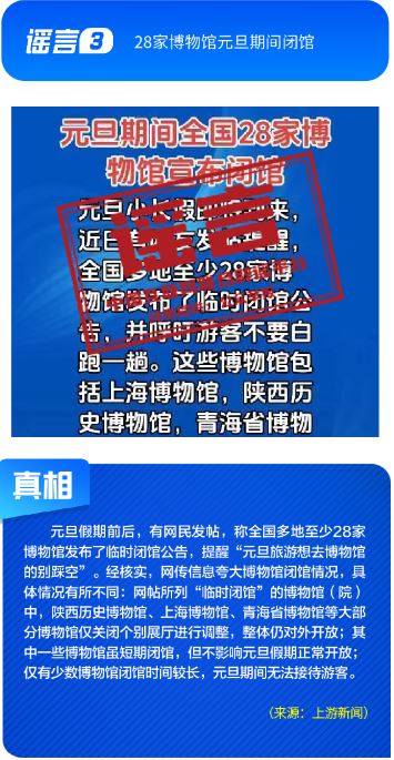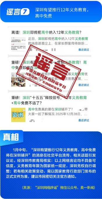 公共政策领域谣言误导公众决策。“社保卡没有有效期限制、未到期不能换新卡”是对社保卡管理政策的误读,给民众平添困扰;“28家博物馆元旦期间闭馆”实为少数博物馆根据运营安排所做的微调,网帖严重夸大实际闭馆情况,引发负面炒作;“深圳有望推行12年义务教育,高中免费”是对现行政策的“超前编造”,误导学生及家长群体;“全国12315平台发布退费公告”,则是假冒监管机构名义散播不实通知,为后续诈骗行为做铺垫。