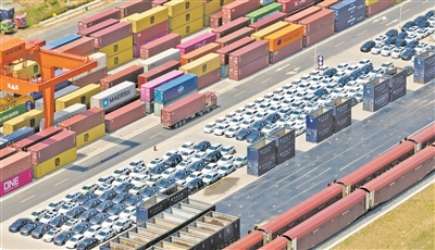 图为等待装车出口的新能源汽车。新华社记者 周牧摄