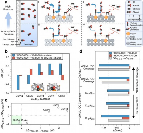 图为该论文的理论计算,表明铜-银稀释合金催化剂表面更利于单齿型吸附的*C=C=O二碳基团的生成,及其需要更高的CO表面覆盖度以保证碳-碳偶联的高效发生。