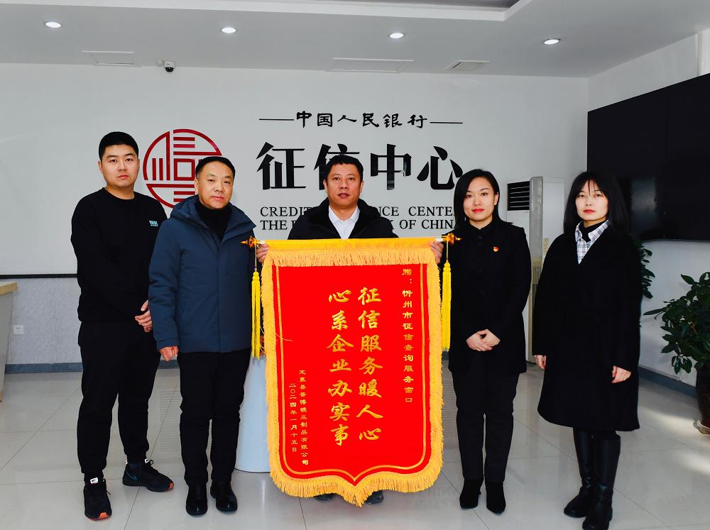 1月15日上午,定襄县晋博锻压制品有限公司负责人将一面写有“征信服务暖人心,心系企业办实事”的锦旗送到了人民银行忻州市分行征信查询服务窗口,感谢为其高效处理征信异议,帮助企业解决资金往来受阻困境。
