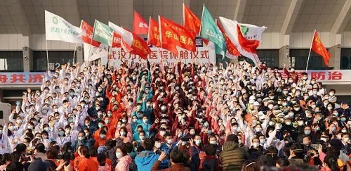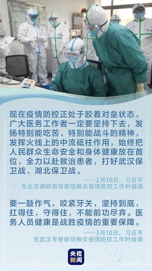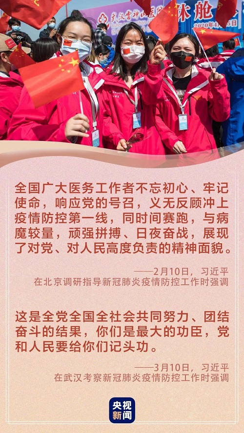 习近平指出,在湖北和武汉人民遭受疫情打击的关键关头,广大医务工作者坚韧不拔、顽强拼搏、无私奉献,展现了医者仁心的崇高精神,展现了新时代医务工作者的良好形象,感动了中国,感动了世界。