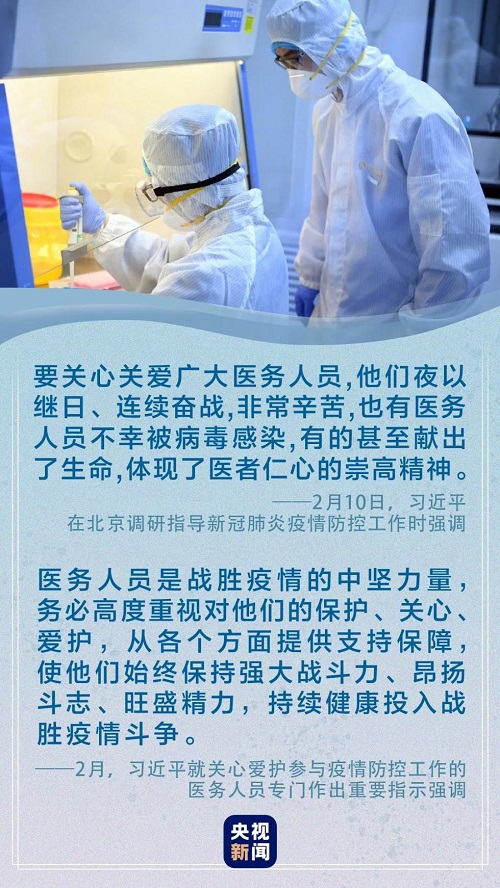 “有关方面要改善大家工作生活条件,落实好各项防护保障措施,加强轮换和休整,尽最大努力确保一线医务人员健康和安全。”“要关心关爱他们,大力宣传优秀典型和先进事迹,帮助解决实际困难和问题,生活、安全、人文关怀都要保障到位。”疫情发生以来,习近平总书记多次强调要关心关爱广大医务工作者。