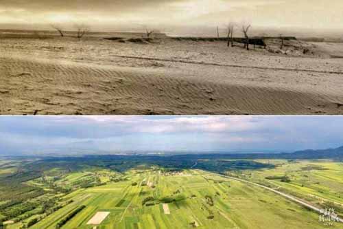 右玉县治理前后对比图,全县林木覆盖率由最初不足0.3%提高到现在的54%。