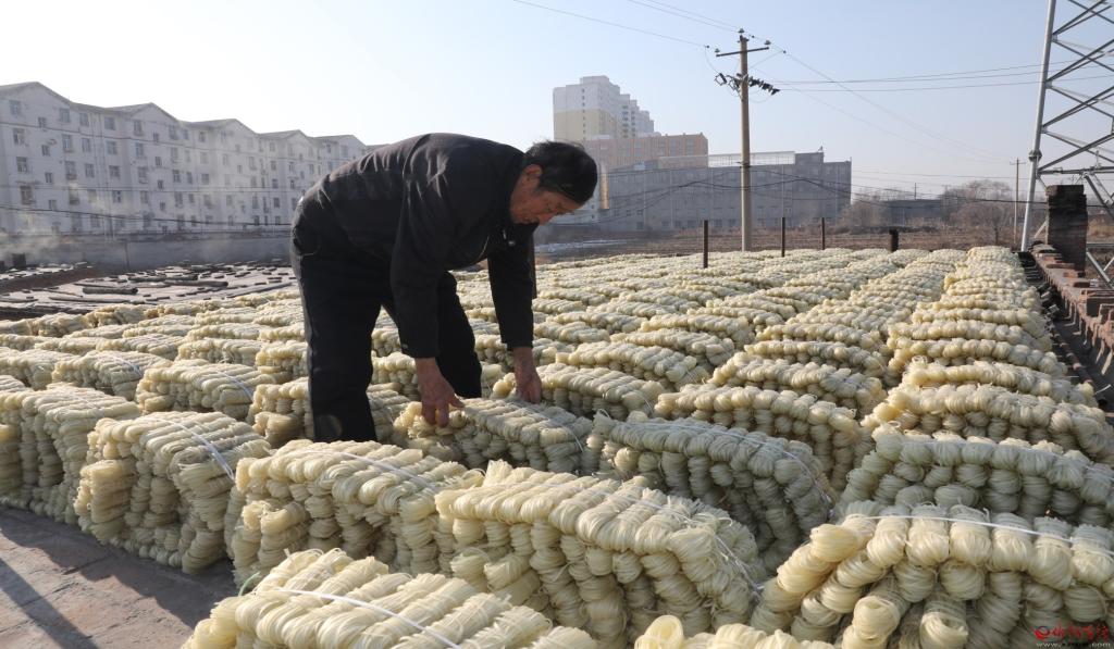 12月23日,原平市新原乡班村老贾粉条加工厂内,老贾正在打捆制作好的粉条。老贾加工粉条已有30多个年头,生产的传统手艺无添加剂绿色粉条,很受市民青睐,不仅占领了本地市场,还远销大同、包头,产品供不应求。 (褚 震 摄)