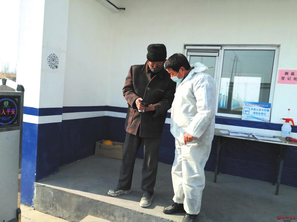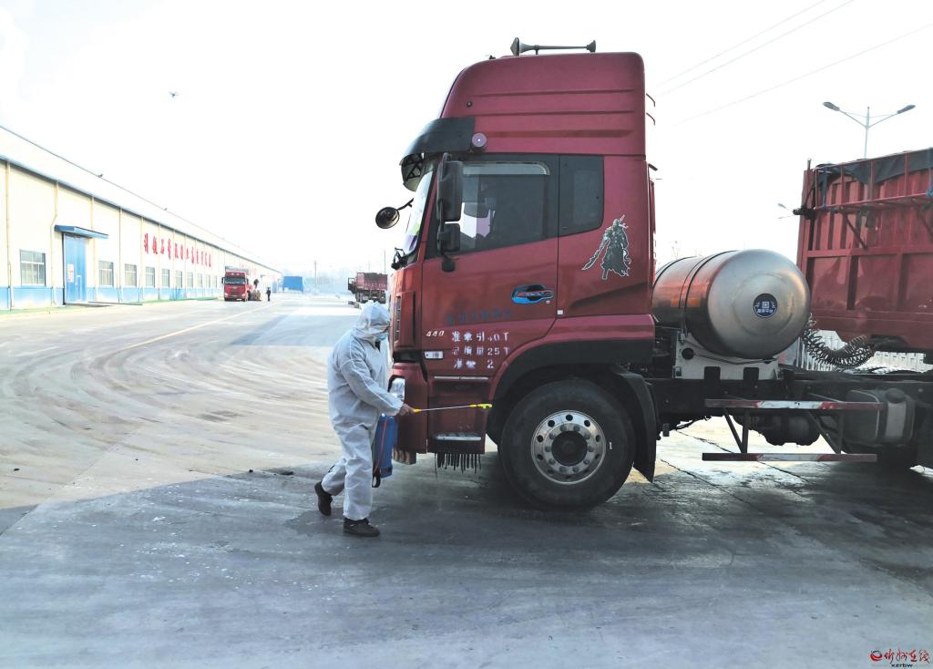 位于忻府区豆罗镇建材工业园区的泰山石膏(忻州)有限公司在疫情防控工作中,严格人员进厂测体温、扫行程码、登记和车辆消杀制度,严防疫情输入。图为1月20日,该公司安保人员正在对进厂送原料的司机扫码登记,并对车辆进行消杀。 (本报记者 张剑雄 摄)