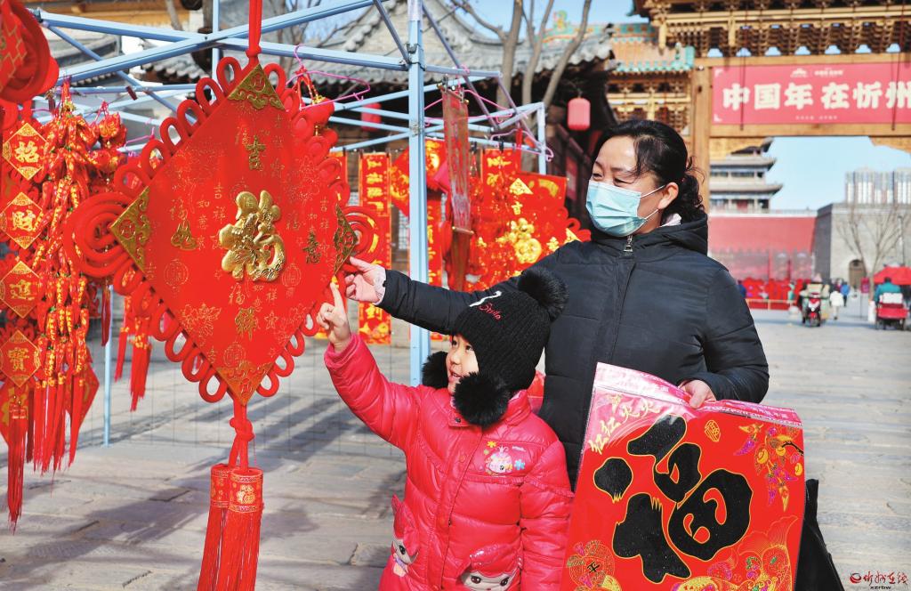 春节临近,我市各大商场和年货市场洋溢着浓浓的年味儿。春联、“福”字、“中国结”等贺岁商品琳琅满目,到处都是红红火火的过年气氛。右图为2月3日,市民在忻州古城南北大街集市上选购年货。 (张存良 摄)