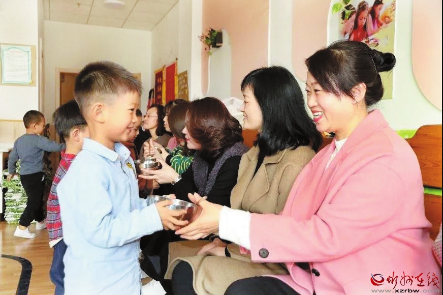 3月8日,忻州市幼儿园雁门分园举办了以感恩为主题的亲子活动,通过形式多样的活动让孩子们陪妈妈一起过节,引导幼儿从小学会感恩,让妈妈们感受到孩子的成长与爱。图为活动当天,幼儿将自己做的梨汤送给妈妈。 (本报通讯员 摄)