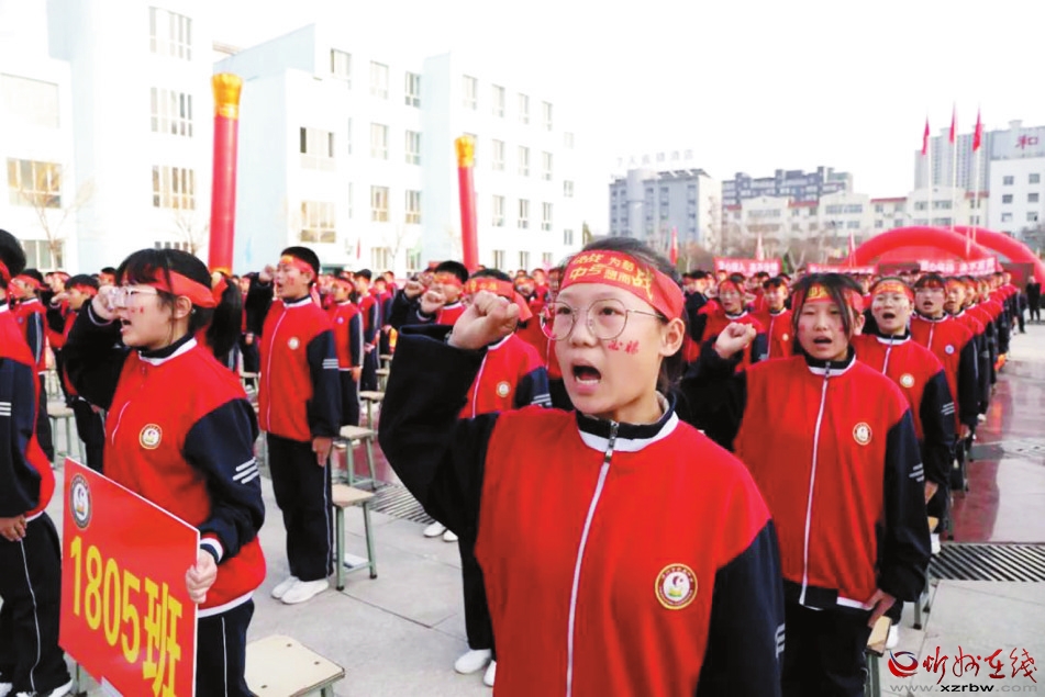 本报讯 为了激发学生竞争意识和拼搏精神,促使初三学生以良好的精神状态投入到中考备考复习中,3月11日下午,忻州市第五中学举行2021届初三中考百日誓师大会,学校领导及家长代表为初三师生加油鼓劲,初三年级全体师生参加。