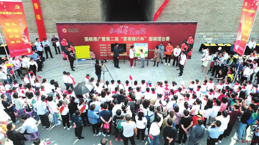 5月22日上午,忻州古城东门永丰门城墙下,来自忻州各围棋培训机构的100名少年儿童,与忻州十几位业余高手车轮对决,用这种别开生面的方式,表达“红领巾永远心向党”的赤子情怀。这一活动由忻州广播电视台通过微视频进行了现场直播。 (郭剑峰 摄)