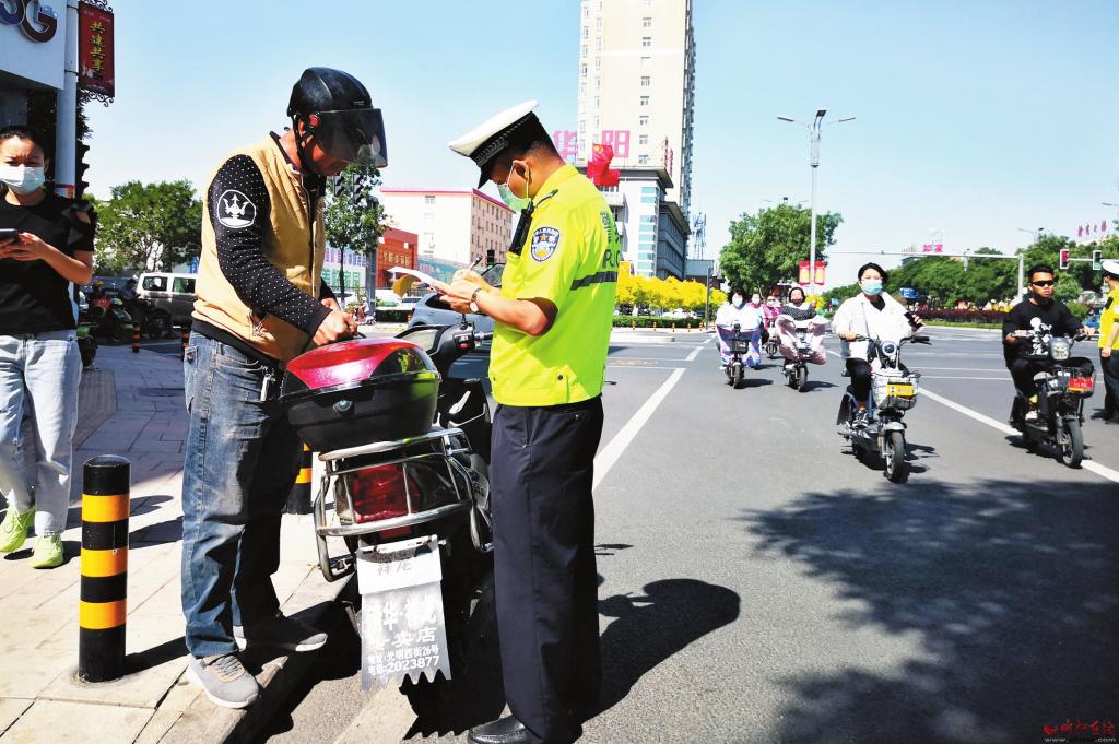 个别市民为了抢几十秒时间,少走几百米路,骑电动车闯红灯、逆行,结果收到交警的罚单。5月27日,在城区建设路与长征街路口,执勤交警一边开罚单,一边苦口婆心地劝说交通违法者:“为了自己和他人的安全,一定要遵守交通法规,摒弃交通陋习,远离交通事故。”(记者 张剑雄 摄)