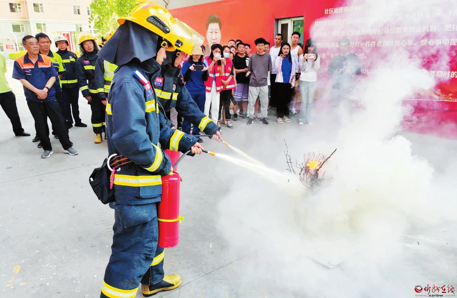 为推进落实消防安全的源头治理,进一步提升小区业主和物业工作人员的消防安全知识及应对火灾突发事件能力,近日,原平市消防救援大队联合北城街道办事处在该市迎宾小区开展消防演练。期间,结合近年来的高层建筑电气火灾案例,消防人员对火场疏散逃生的基本常识、火灾的应急和预防、消防器材的使用方法进行讲解,引导小区物业工作人员和业主拿起灭火器进行实际操作,切实了解和掌握灭火器的正确使用方法,进一步增强辖区群众应急防范能力和安全意识。图为正确使用灭火器演示现场。(刘 强摄)