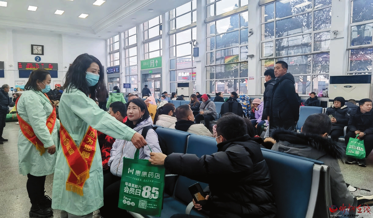工作人员在忻州火车站向候车乘客发放防流感药品、口罩等健康礼包