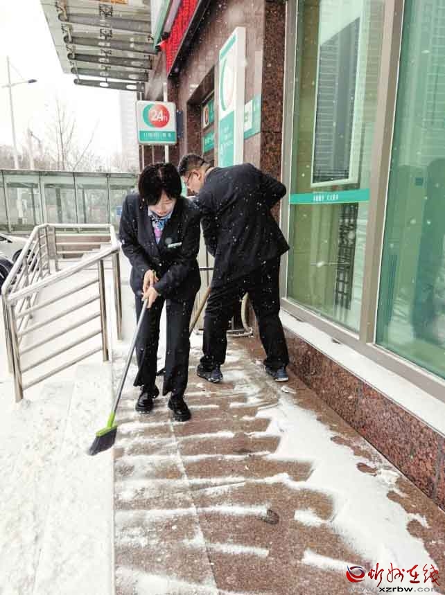 面对我市首场强降雪,农行忻州分行员工以雪为令,及时清扫网点及周边区域,确保服务通道畅通无阻,以实际行动传递了温暖的金融服务。(殷俊摄)