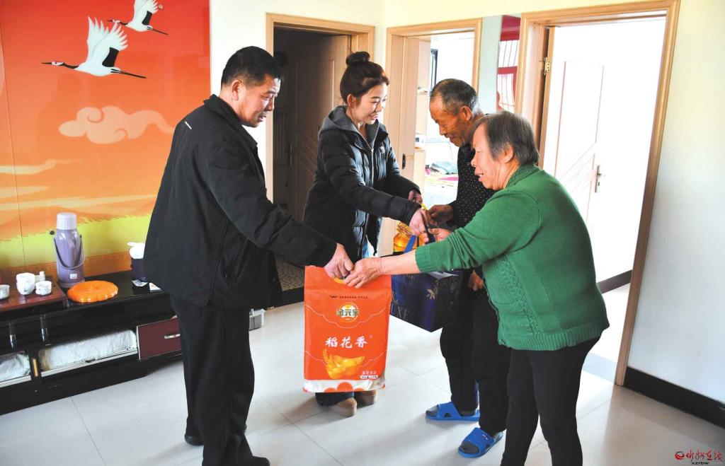 春节期间,五台县北一村到村工作大学生赵雪婷(左二)自费购买大米、食用油、牛奶等,和村委会干部来到78岁退伍军人王还吉家中进行慰问,并与老人促膝谈心,鼓励刚经历丧子之痛的老两口振作起来,好好生活。(王金龙 摄)