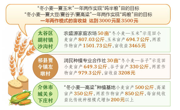 令人欣喜的是,实践给出了响亮而积极的回答。我省“冬小麦—夏玉米”一年两作实现“吨半粮”田的目标,“冬小麦—夏大豆/夏谷子/夏高粱”一年两作实现“吨粮”田的目标,一年两作模式的亩收益达到3000元至3500元。太谷区胡村镇沙沟村农盛源家庭农场50亩“冬小麦—玉米”示范田小麦亩产807.03公斤、玉米亩产694.7公斤,两茬作物亩产1501.73公斤,亩收益3465元。祁县贾令镇左墩村润民种植专业合作社30亩“冬小麦—谷子”示范田小麦亩产649.3公斤、谷子亩产330公斤,两茬作物亩产979.3公斤,亩收益3208元。介休市城关乡下庄村“冬小麦—高粱”种植基地小麦亩产500公斤、高粱亩产350公斤,两茬作物亩产850公斤,每亩纯收益比传统种植模式增加200元以上。