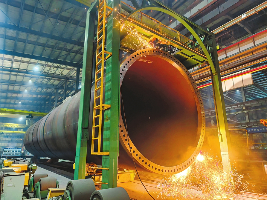 1月19日,在省级装配式建筑产业链“链核”企业山西钢构科工有限公司智能制造车间内,一台巨型压力容器正进行焊接作业。辊道与龙门架稳稳托举着数十米长的钢构件,自动化系统实时监测焊缝质量,全力保障昔阳、阳曲、广灵、屯留等地风电项目塔筒制作。 贾晓瑞 王宇摄