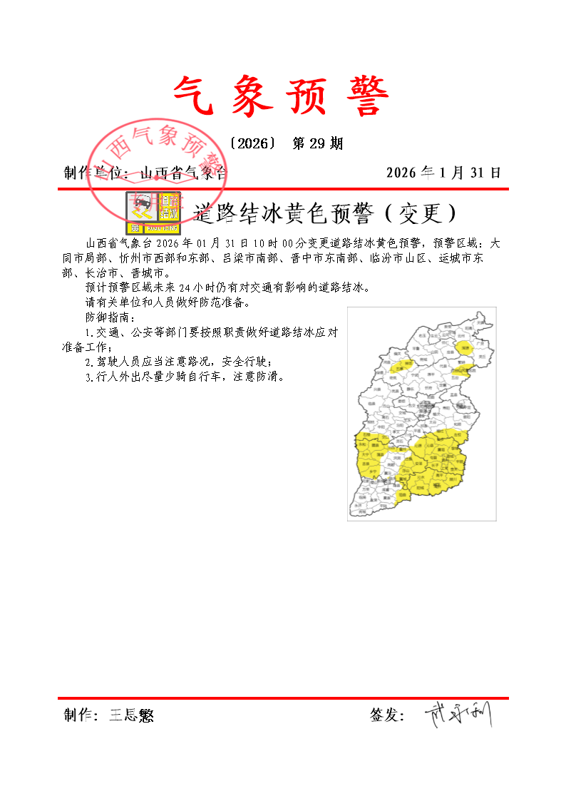 山西省气象台2026年01月31日10时00分变更道路结冰黄色预警,预警区域:大同市局部、忻州市西部和东部、吕梁市南部、晋中市东南部、临汾市山区、运城市东部、长治市、晋城市。预计预警区域未来24小时仍有对交通有影响的道路结冰。请有关单位和人员做好防范准备。防御指南:1.交通、公安等部门要按照职责做好道路结冰应对准备工作;2.驾驶人员应当注意路况,安全行驶;3.行人外出尽量少骑自行车,注意防滑。