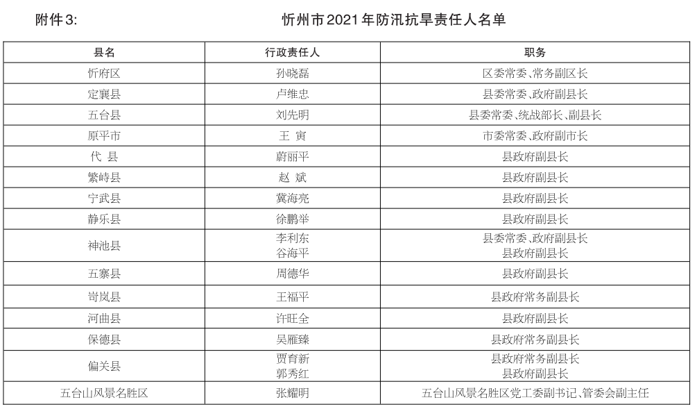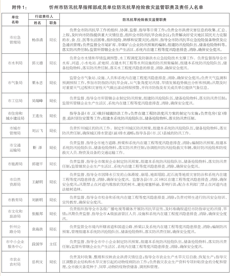 1.忻州市防汛抗旱指挥部成员单位防汛抗旱抢险救灾监管职责及责任人名单