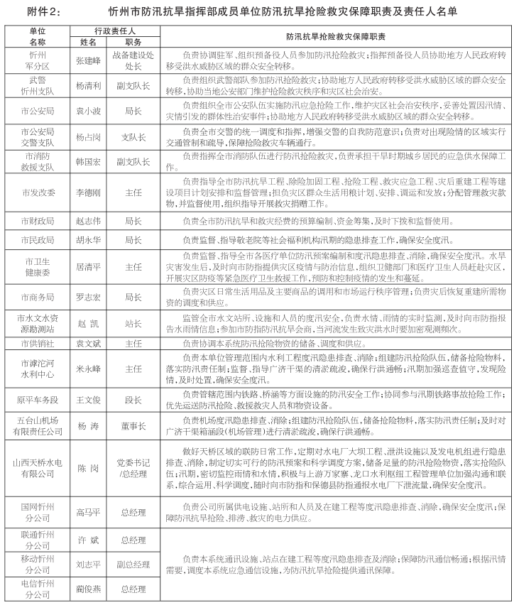 2.忻州市防汛抗旱指挥部成员单位防汛抗旱抢险救灾保障职责及责任人名单