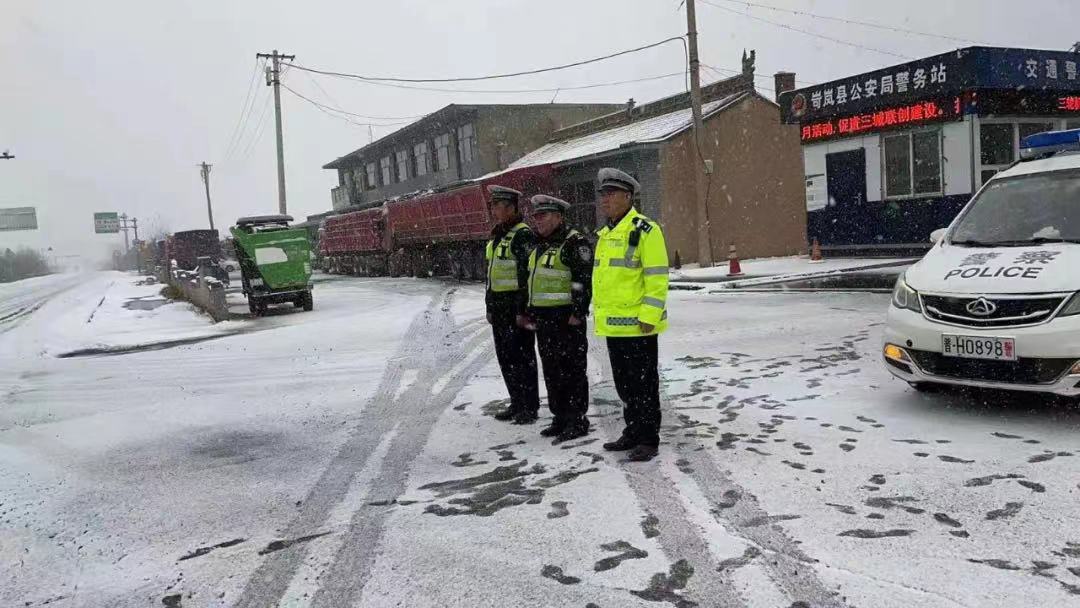 11月6日,岢岚辖区内出现降雪,道路出现积雪现象。为保障道路交通安全有序,预防减少恶劣天气重大交通事故发生,岢岚交警按照雪天道路交通保障应急工作要求,民辅警迅速到岗到位,以饱满的精神状态全力投入雪天指挥疏导、处理交通事故等工作中,全力保障车辆有序通行,确保辖区群众出行安全。