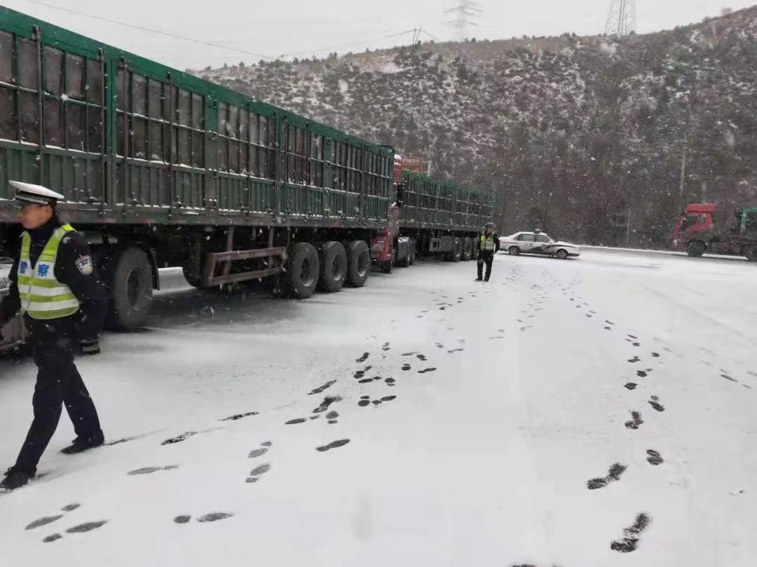 11月6日,辖区出现降雪天气,部分路面积雪结冰。为了预防和减少道路交通事故,偏关县公安局交警大队在重点湿滑路段加派警力,对行驶车辆进行交通疏导。