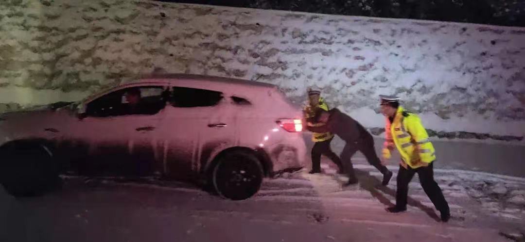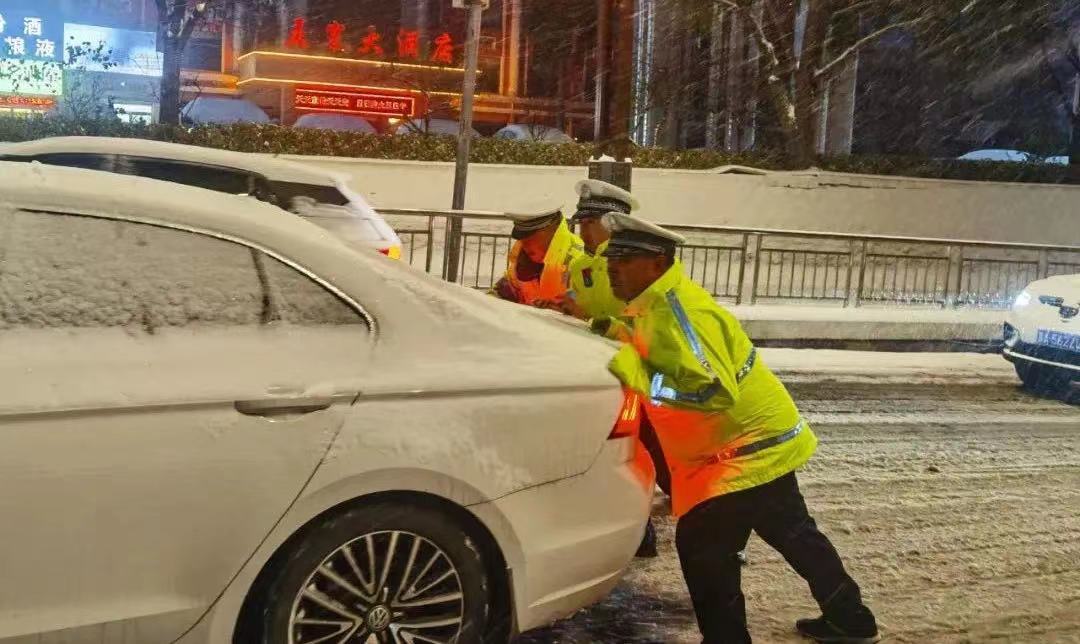 神池县境内夜间道路积雪较厚,涧口坡路段车辆打滑被困,安全股和龙泉中队执勤民辅警协助推车,全力保障人们出行平安