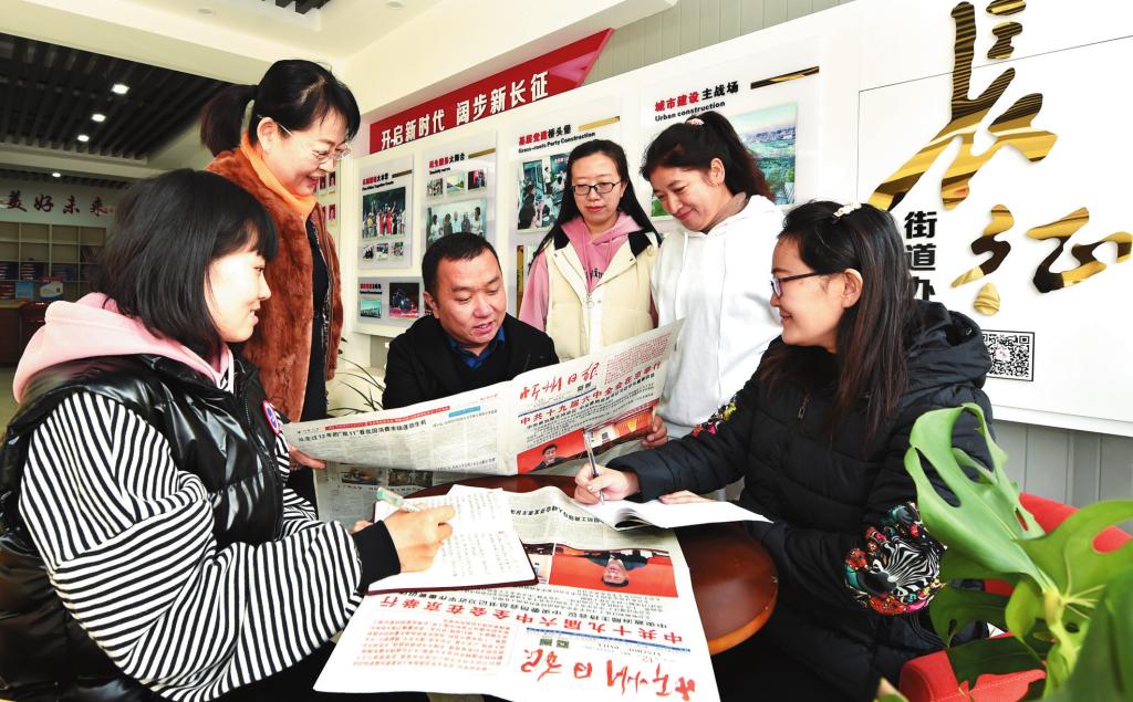 忻府区长征街街道办事处和平东街社区工作人员认真学习十九届六中全会精神。冯晓磊 摄