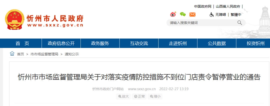 2月23日以来,忻州市市场监督管理局落实省市疫情防控专题会议精神,对忻府区范围内商场、超市、宾馆、酒店、药店等经营场所的疫情防控落实情况进行督查检查,发现个别门店落实疫情防控措施不到位,责令暂停营业。通告名单如下:
