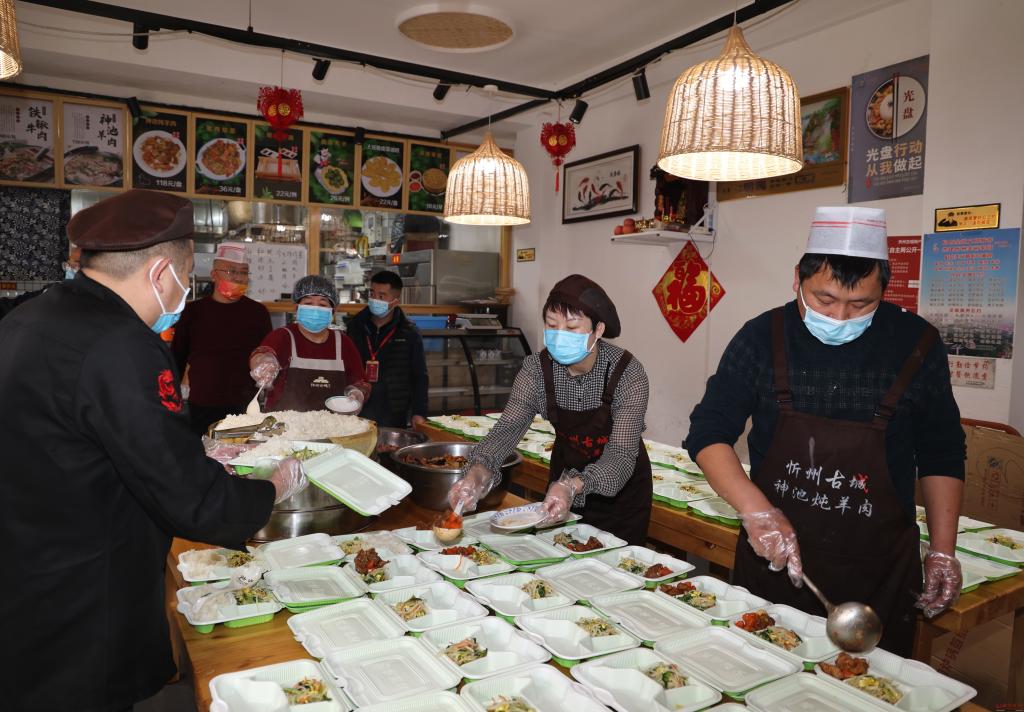 “那个餐盒再加点菜,汤要另外盛。”2月28日上午11时,忻州古城的神池炖羊肉餐馆里,赵海英正忙乱地招呼着店员们将刚出锅的菜分装到餐盒里,丈夫武海军将打包好的餐盒装到车上。为了准备这份爱心午餐,夫妇二人当天上午8点就开始在后厨里准备。从配菜、烹制到打包、送餐,他们都格外用心,严格把关。