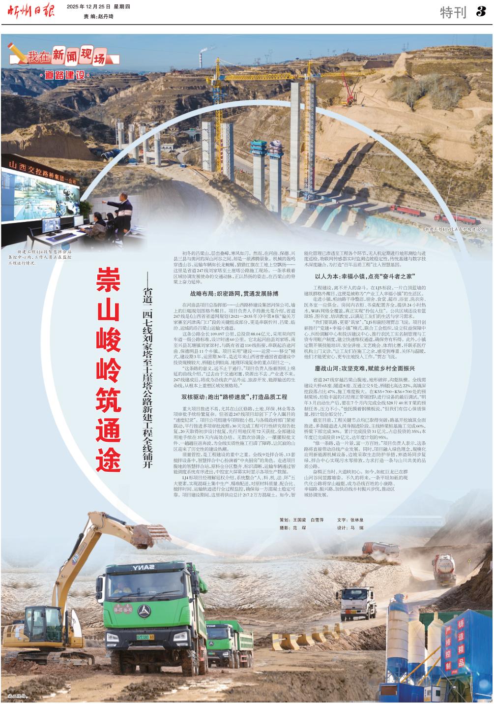 初冬的吕梁山,层峦叠嶂,寒风如刀。然而,在河曲、保德、兴县三县与黄河的深山河谷之间,却是一派沸腾景象。机械的轰鸣穿透山谷,运输车辆如长龙蜿蜒,猎猎红旗在工地上空飘扬——这里是省道247线刘家塔至土崖塔公路施工现场。一条承载着区域协调发展使命的交通动脉,正以昂扬的姿态,在吕梁山的脊梁上奋力延伸。