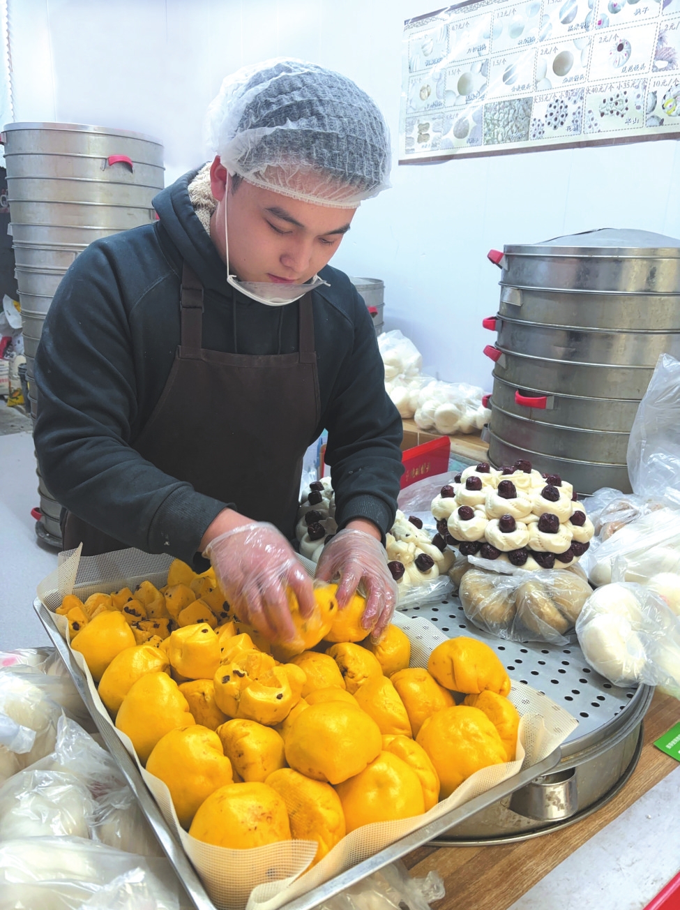 年轻的“蒸二代”,为老铺子带来了新气象。他将流行歌曲改编成“揉面进行曲”,用抖音记录做馍日常,不少年轻人循声寻味而来。他还顺应时节推陈出新,春节的花糕、寿宴的桃馍,以及爆汁红糖卷、南瓜豆包、红枣开花馒头等新中式面点陆续上线,花样多达五十余种。尽管品类不断翻新,但馒头的灵魂始终是那块传承多年的老肥面种。“这是根,丢了,味儿就变了。”邸尚伟说。