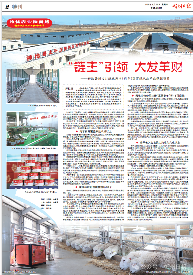 初春时节,万象更新。当第一缕晨光铺洒在神池县东湖乡,一幅热气腾腾的现代肉羊产业发展图景正徐徐展开。天牧生物、东元农牧、神龙牧生物、忻牧生物四家龙头企业紧密协同,将种源繁育、生态养殖、饲草保障、精深加工、防疫环保等串成了闭环完整的肉羊全产业链,让神池传统养羊业在新时代焕发出强劲生机。