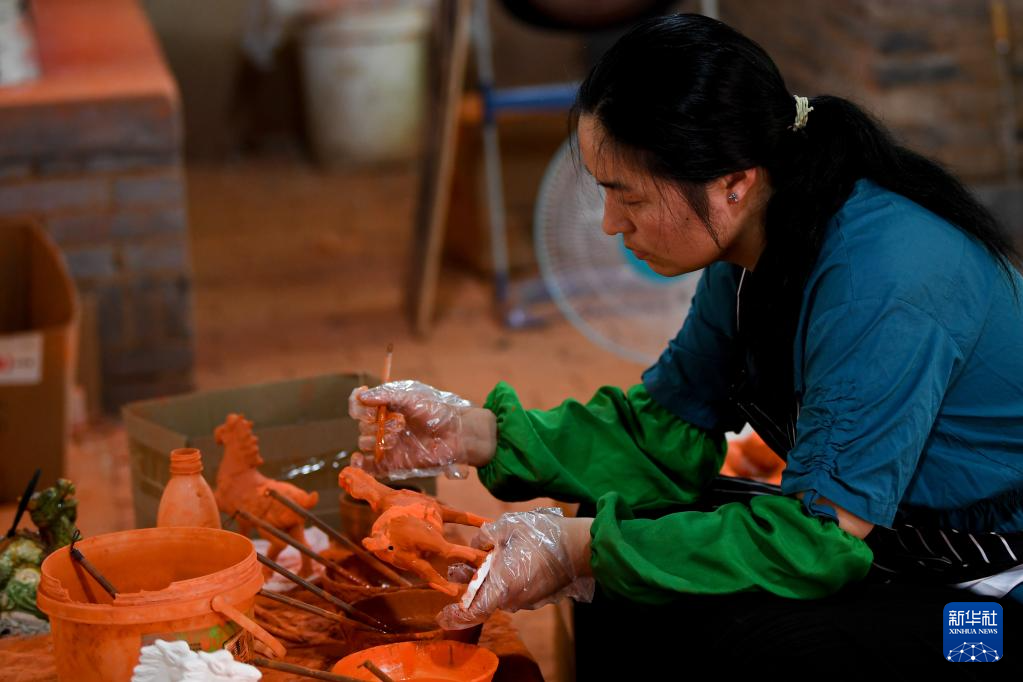河南省洛阳市朝阳镇南石山村以生产唐三彩而闻名。近年来,当地政府积极引导三彩产业数字化建设工作,推动唐三彩烧制技艺传习馆、唐三彩陶艺博物馆、唐三彩文化研学所等优化升级。目前,南石山村唐三彩产业的专业烧制艺人有2000余人、文化企业68家,年产值达3.5亿元。新华社记者 吴刚 摄