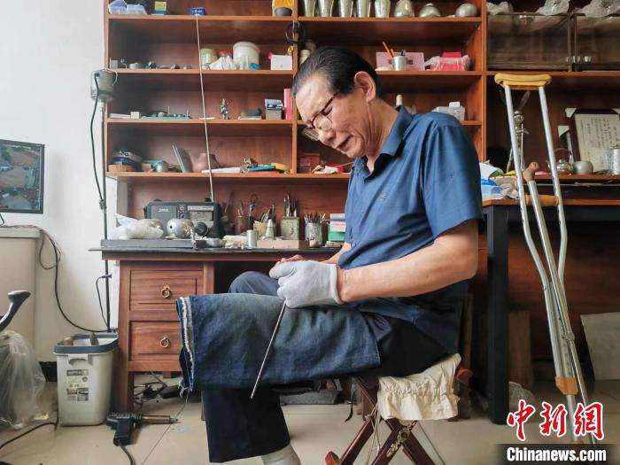王圣良告诉记者,小时候他因为生病,腿脚落下了残疾,别的兄弟姐妹出去玩,他就跟着爷爷学习锡雕。“做锡雕需要心静、身静,因为行走不方便,我比其他人更坐得住,在学习锡雕上更有‘优势’”。