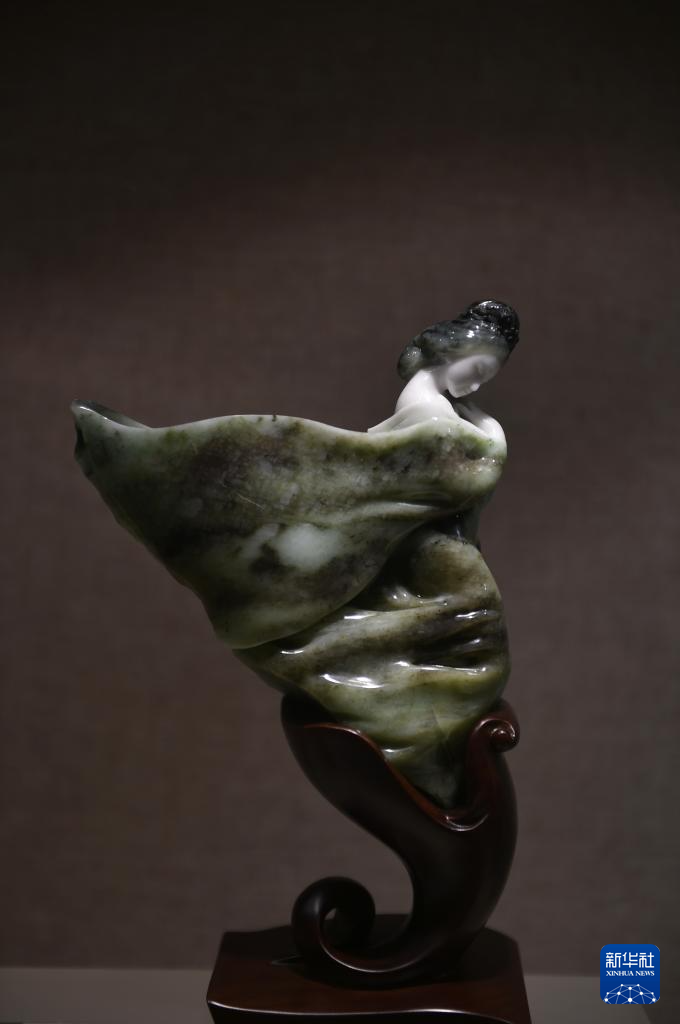 这是在河南省镇平县一家玉雕企业的展厅内拍摄的玉雕作品《绿云清梦》(8月16日摄)。