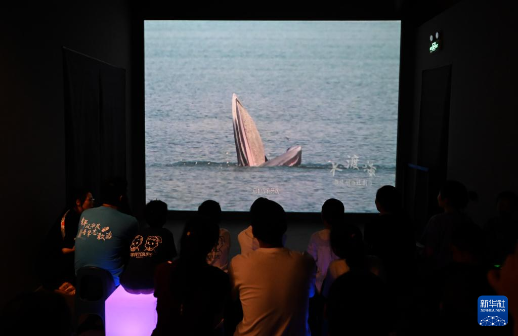 8月26日,游客在国家海洋博物馆“鲸奇物语”展区观看鲸鱼相关科普视频。