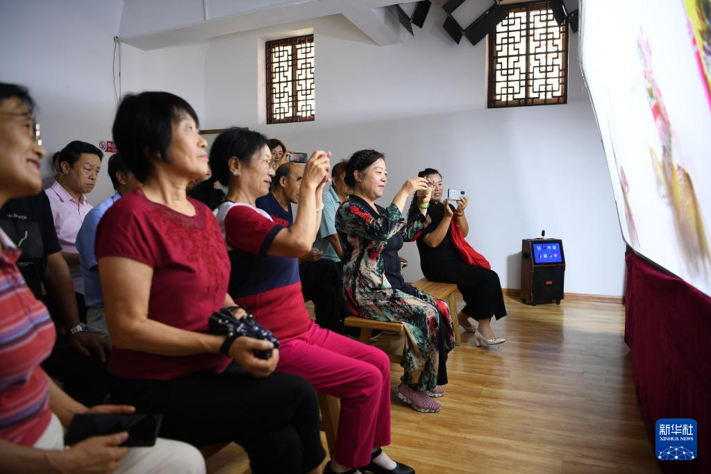 9月16日,市民在玉田县“非遗会客厅”皮影工坊内观看皮影戏表演。