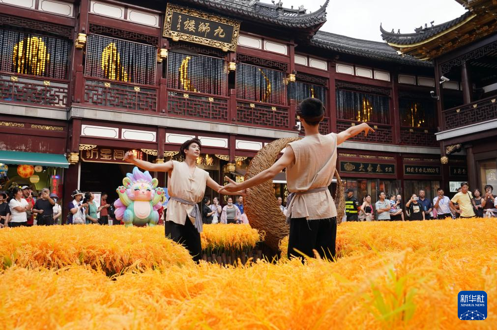9月17日,游客在豫园商城“丰收的麦田”场景中,欣赏演员表演丰收舞。