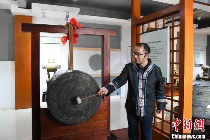 近日,在广西河池市东兰县,东兰民间铜鼓收藏馆馆长陈真阳为“2023年两岸媒体壮美广西行”采访团介绍该馆“镇馆之宝“,一面产于明朝的双面铜鼓。蒋雪林 摄