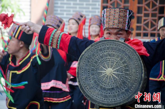 近日,在广西河池市东兰县的东兰民间铜鼓收藏馆内,一场精彩的铜鼓舞正在上演。翟李强 摄