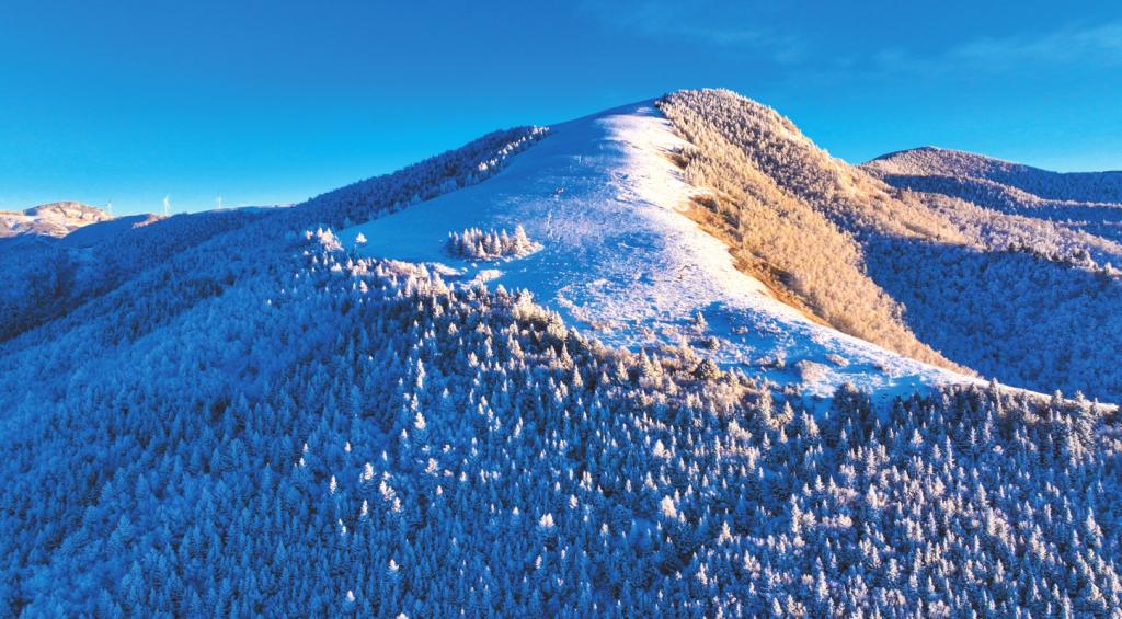 冬之净,返璞归真的意蕴。当一场大雪如期而至,金山梁便彻底沉静下来,进入一个冰雕玉砌的童话世界。梁顶之上,积雪平整如镜,宛如琼瑶铺地,反射着清冷而纯粹的日光。而当阳光突破云层,照射在冰面上,则光芒闪耀,令人不敢直视。松枝上堆满了蓬松的积雪,傲立于山崖,尽显在严酷中坚守的坚韧品格;山间那些奇形怪状的岩石,覆上白霜后,更是空蒙清灵,意韵悠长。生命的痕迹并未完全消失,偶有野兔为了觅食奔跃而过,在雪地上留下一串轻盈的足迹,但转瞬便被新雪覆盖,似乎了无痕迹;时有耐寒的鸟儿掠崖飞去,翅羽间振落的冰晶,在空中划出一道优美的弧线。