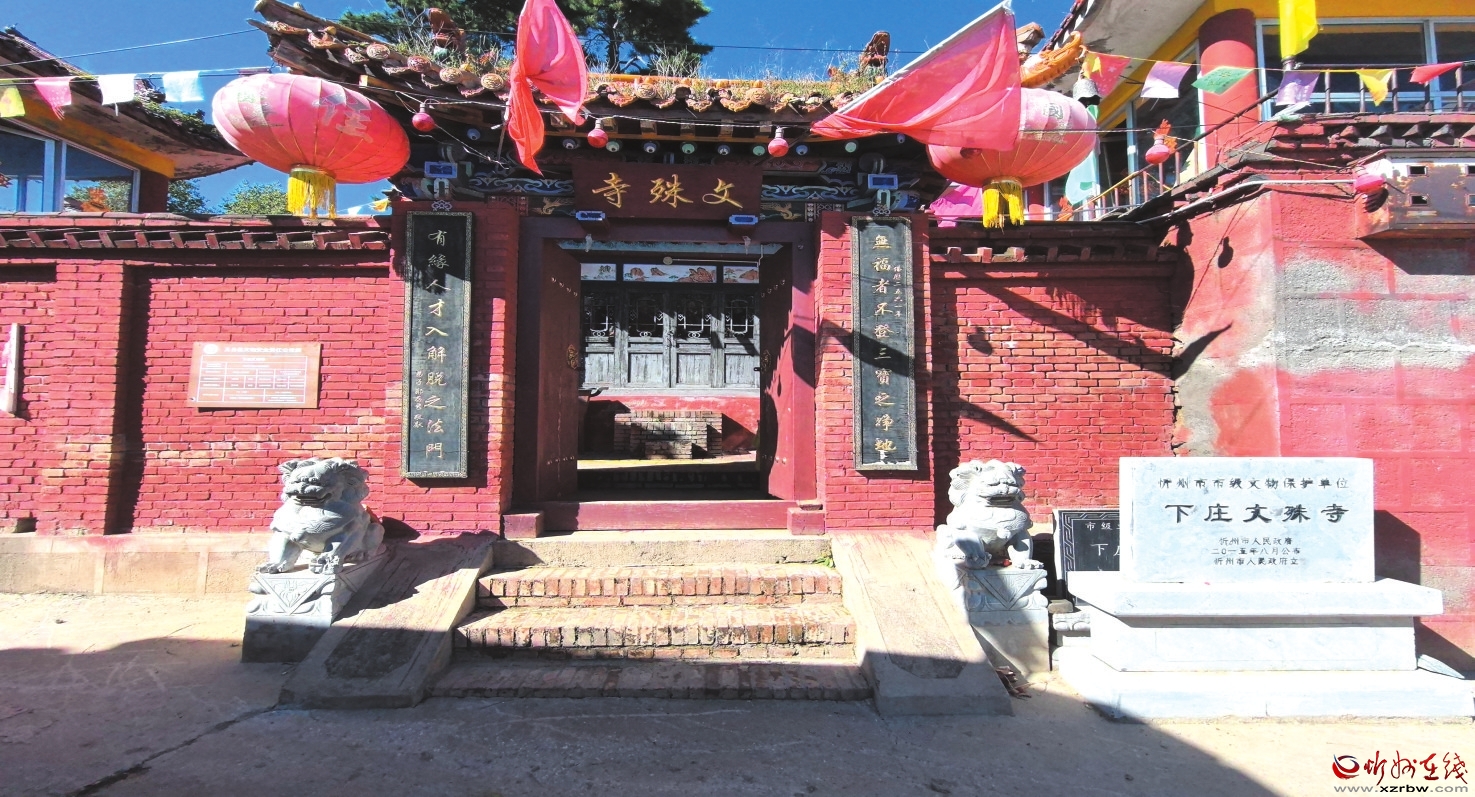 下庄文殊寺位于五台县东雷乡下庄村中,始创年代不详,现存建筑为明代所建。寺庙坐北向南,占地面积368平方米。山门一间,中置板门。正殿面宽三间、进深五椽,前出廊(此走廊属清代遗构,为后期加接),廊柱施斗拱,大斗口内出跳,两侧带有雕花翼拱。檐柱头斗拱为五踩,其下昂已被锯掉(现存昂嘴为清代更换的如意昂式);平身科斗拱亦为五踩。当心间设门,两次间设直棂窗。