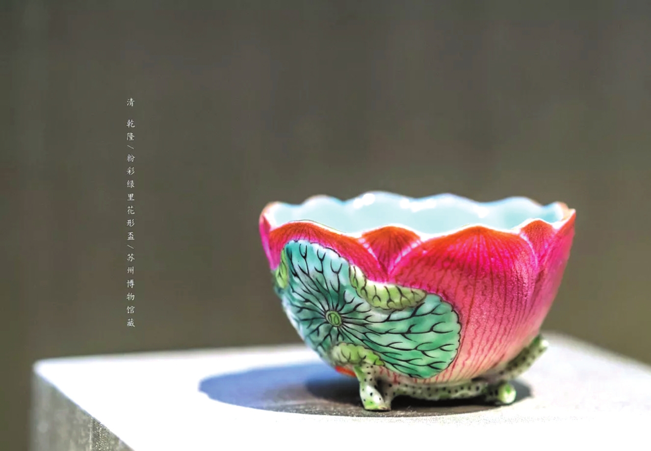 相比之下,仿生瓷则源于对自然的崇尚,以丰富的造型模拟自然物象,取材生动,花草蔬果、鸟兽虫鱼,以至木石纹理皆可入瓷。它们或泼辣清新,或简练朴素,既展现了工匠高超的塑形技艺,更传递着“天人合一”的造物思想以及追求野趣、崇尚自由、返璞归真的人生境界。如元龙泉窑荷叶盖罐、万历青花梵文莲瓣盘、乾隆粉彩绿里花形杯、道光木纹釉花盆等,都是平时难得一见的馆藏仿生瓷器。(许鑫城)