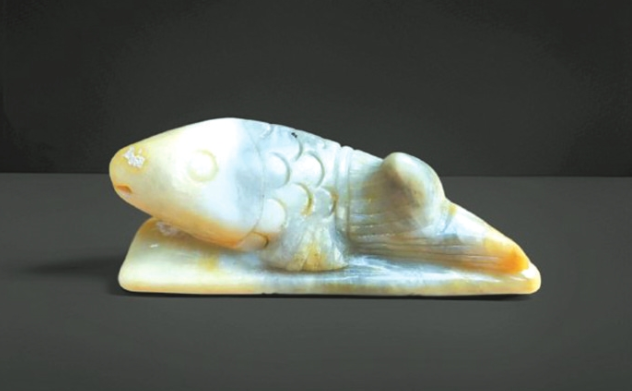 笔者藏有一件“鱼跃竹排”白玉笔架,长10厘米,宽2.5厘米,高3.6厘米。笔架雕一硕大鱼儿跃于竹排之上,以双鳍为支撑,鱼尾舒展,一侧贴于排面,另一侧微微倾斜向上、向左卷曲,恰好承笔;鱼头昂扬,宛如一幅鱼乘竹排、畅游河中的立体画卷。