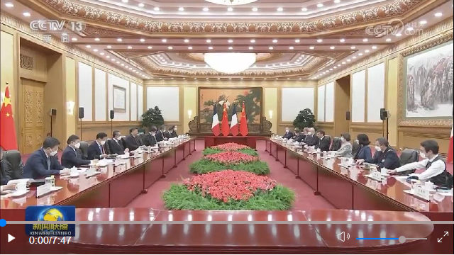 马克龙表示,我对3年多前访华情景记忆犹新,非常高兴再次访华,同习近平主席共同探讨进一步提升法中全面战略伙伴关系。我完全赞同习近平主席对法中关系的积极评价以及就发展双边关系提出的重要建议。明年法中将共同庆祝建交60周年。60年来,法中关系保持了稳定健康发展。虽然法中两国发展模式不同,但双方相互尊重,坦诚交流,各领域合作实现了互利互惠,同时在合作应对当今世界面临的全球性挑战方面取得重要进展。法方尊重并奉行一个中国政策。我此次率庞大代表团访华,就是希望同中方加强合作,促进人文交流。法方祝贺中方成功举办昆明-蒙特利尔《生物多样性公约》第十五次缔约方大会,希望继续在气候变化、粮食安全等问题上同中方密切沟通合作。中方将举办第三届“一带一路”国际合作高峰论坛,法方愿同中方就此开展合作。法方赞赏中方始终遵守联合国宪章宗旨,为解决国际地区热点问题发挥积极作用,期待同中方密切沟通协作,努力实现世界的持久和平与稳定。