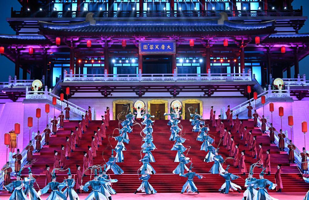 5月18日晚,出席中国-中亚峰会的中亚国家元首夫妇陆续抵达陕西省西安市大唐芙蓉园,参加在这里举行的欢迎仪式。这是演员在欢迎仪式上表演。(新华社记者申宏摄)