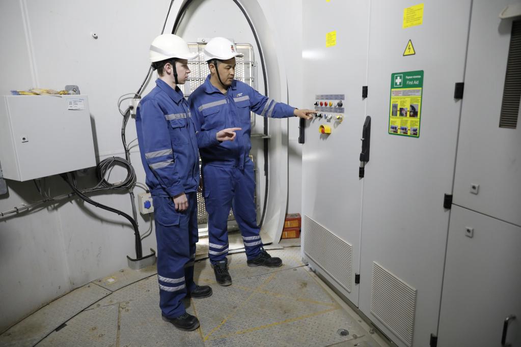 4月3日,在哈萨克斯坦札纳塔斯,风电项目检修工程师阿比尔加济耶夫(右)与同事在风机内部工作。2021年6月,由中哈共同投资、中国企业承建的札纳塔斯100兆瓦风电项目竣工投产。(新华社发,奥斯帕诺夫摄)